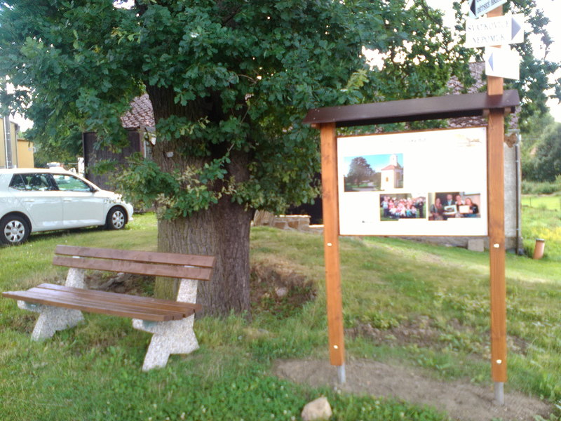 Informační cedule, rozcestníku, lavička pod dubem